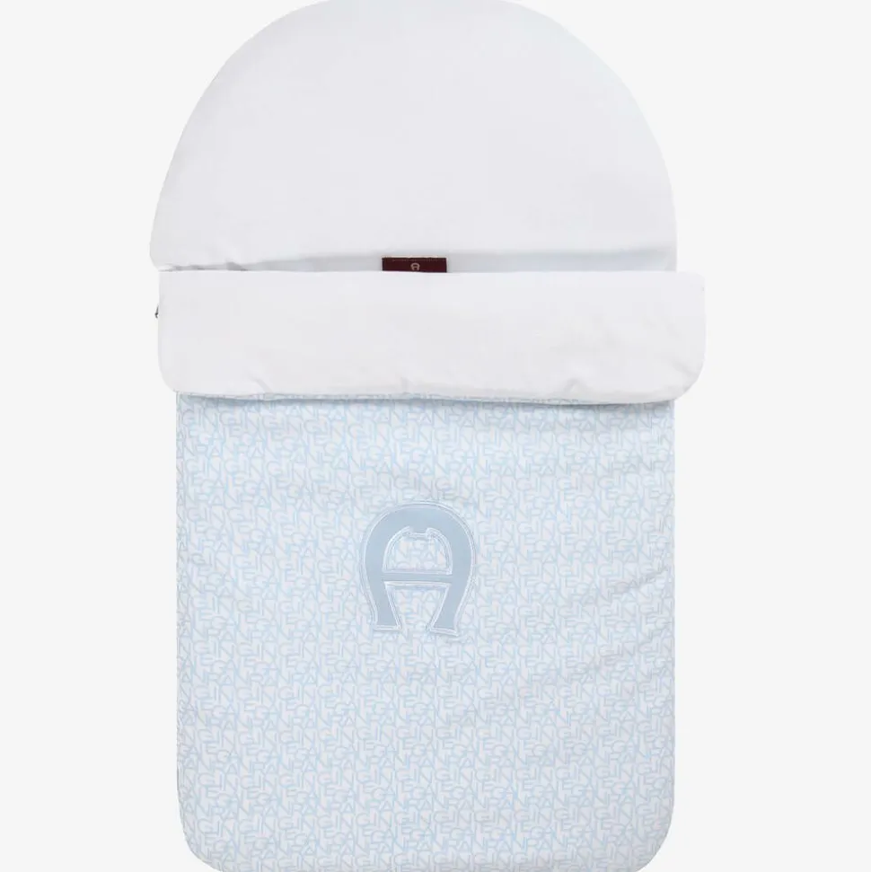 Baby boys white nest with a pale blue logo pattern by AIGNER. Made from soft Pima cotton jersey, it has a white and pink embroidered 'A' logo, a warm padded hood and long zip fastening.