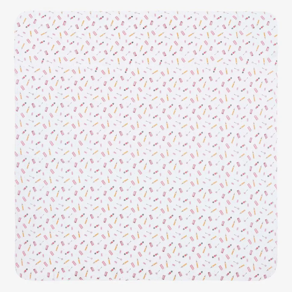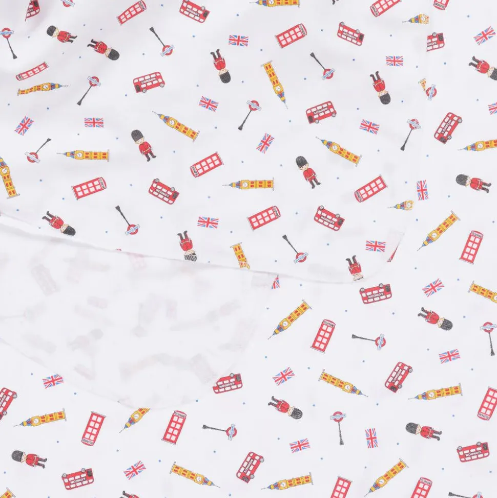 Cute white swaddle blanket for boys and girls by Magnolia Baby, printed with iconic London images in red and yellow. Made in super soft Pima cotton jersey, it is breathable and lightweight, making it easy for swaddling. A versatile accessory, it can also be used as a nursing cover or when out and about in the pram or car seat.