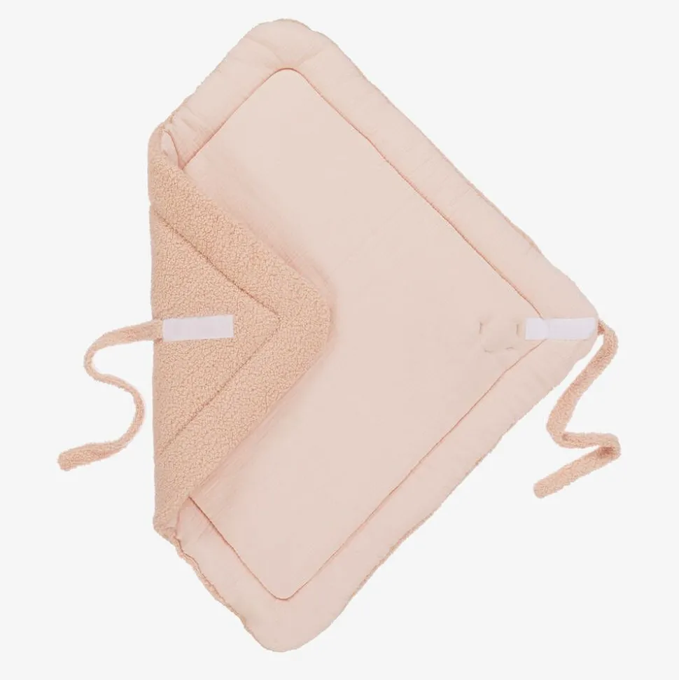 Cosy pink nest for baby girls by Jamiks, with a super cute teddy bear appliqué on the front. In a wrap-around style, it is made in warm bouclé fleece and secured with velcro and ties on one side. With mid-weight padding, it has a lightweight, organic cotton cheesecloth lining for comfort and can be opened out to be used as a soft surface on which to lay baby.