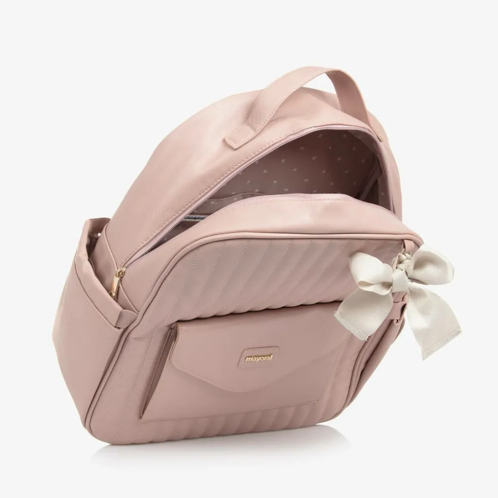 Stylish pink changing bag by Mayoral, in a practical backpack style with a decorative sparkly gold bow detail. Made in faux leather, this sturdy design has a quilted front with a gold-tone metal logo on the front flap pocket. It is fully lined and has useful internal pockets, including a thermal bottle pocket. There are elasticated pockets on the sides, one designed to hold wipes for easy access. The shoulder straps are adjustable and the bag can be stored on the stroller using the detachable velcro straps or held with the top carry handle.