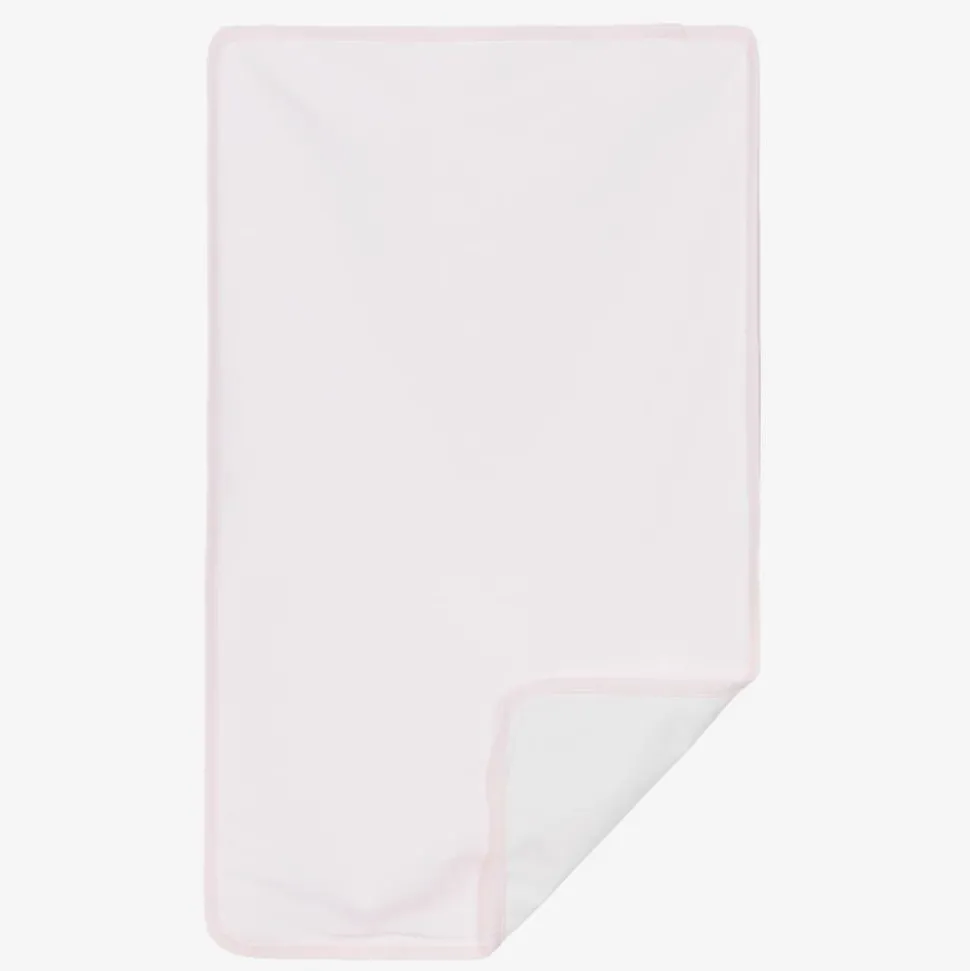 Pale pink changing bag by Nanán, made in soft quilted cotton jersey. It has a main zipped compartment with internal pouches to store lightweight essential items safely. There is a velcro-fastening pocket on the front, with a cute teddy appliqué. The bag has a short handle for easy carrying and a longer strap for attaching to a stroller. It comes with a lightweight jersey changing mat.