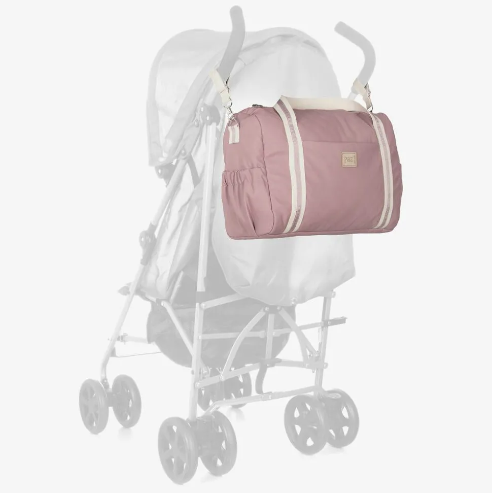 Lovely and practical beige changing bag by Spanish brand, Paz Rodriguez. It is made in soft and water-resistant faux leather with a grained-texture and a lightly quilted lining. Fastening with a top zip, the main compartment has two slip pockets and elasticated side straps, useful for organising baby essentials on the go. In addition, there is a removable rigid base so the bag can stand better if preferred and further three slip pockets on the exterior. It comes with two ivory woven carry handles, a matching detachable shoulder strap and two buggy straps.