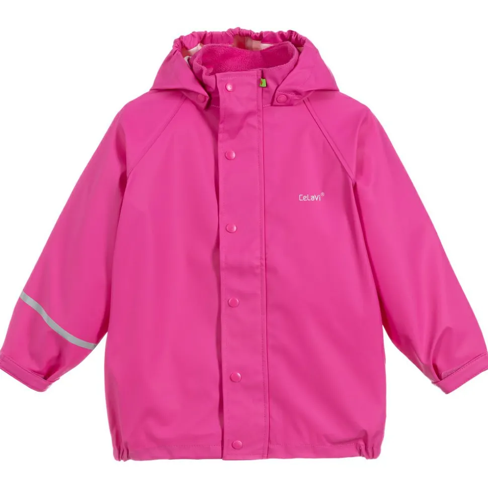 Girls and boys pink waterproof raincoat from CeLaVi. It is made in smooth PU coated polyester, with a reflective silver logo on the chest, hood and a stripe on one sleeve. It has a detachable hood, a soft fleece collar and adjustable cuffs with velcro fastening.