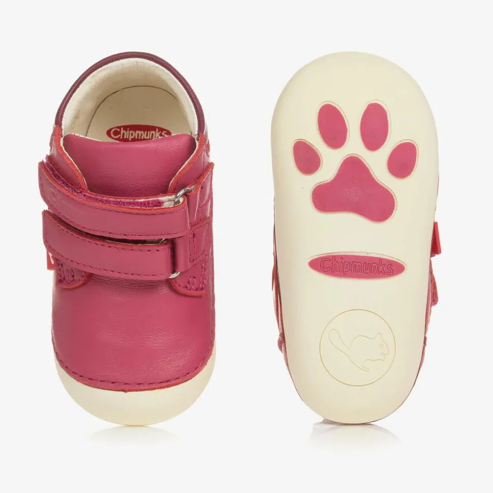 Deep pink first-walker boots for girls by Chipmunks, made in soft leather. Fastening with easy-to-use velcro, these comfortable shoes have a faux leather lining and insole. The rubberised sole is flexible and treaded with a paw print, just right for those first little steps.