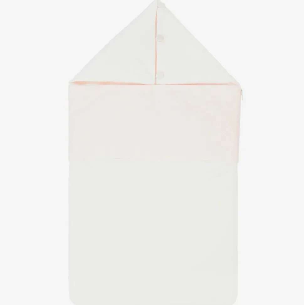 Ivory nest for baby girls by Emporio Armani, made in soft cotton jersey. The hood lining and front panel are made in luxury soft cotton, with a pale pink Eagle logo pattern. The nest is lightly padded and the hood can be unbuttoned and used as a pillow.