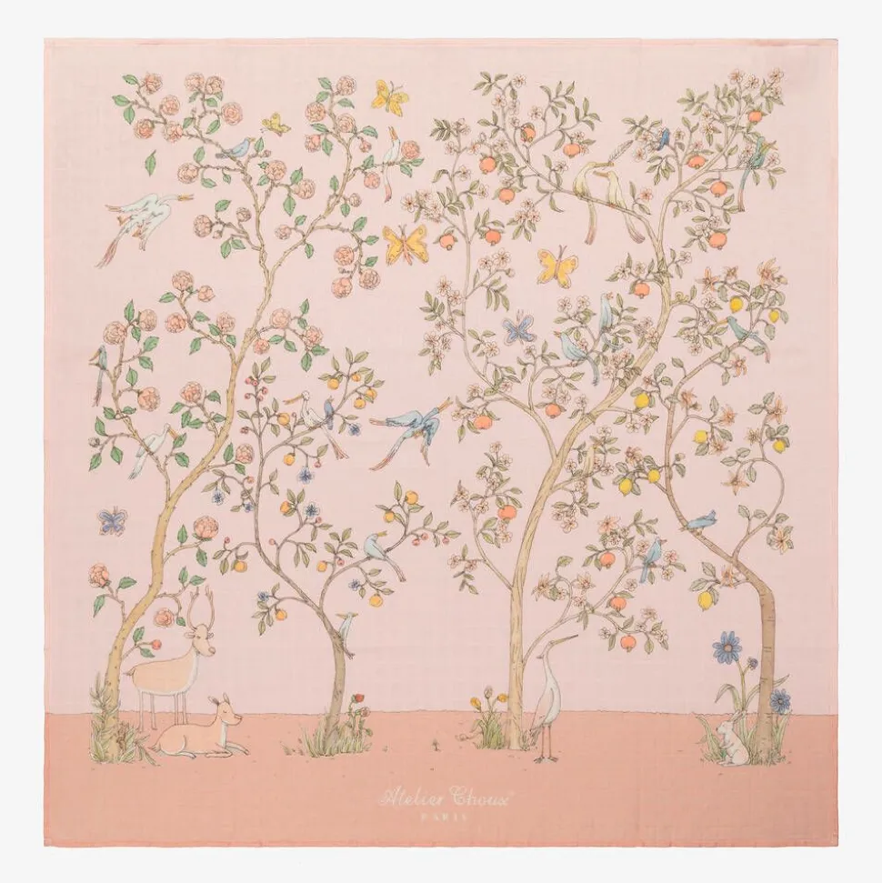 A beautiful pink swaddle and bib set for baby girls by Atelier Choux Paris, made from delicate organic cotton. Blooming with wildlife, this set has a charming nature-inspired print with a reversible white design on the bib. Fitting neatly around your little one's neck, the bib secures using adjustable gold-tone poppers. A lightweight muslin swaddle complements this classic gift, lovely for use as a pram cover, a lightweight blanket and cleaning little spills.