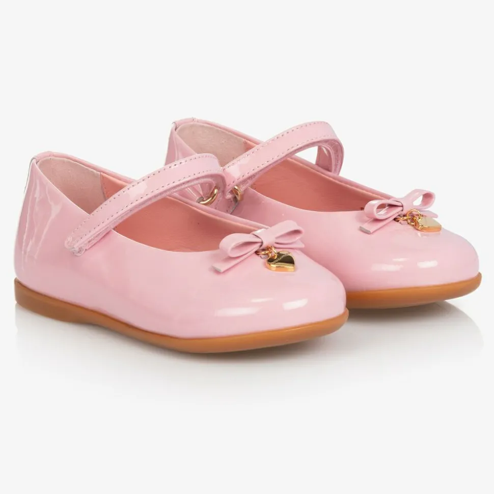 Girls pink patent leather ballerina pumps from luxury designer Dolce & Gabbana. They have a gold logo embossed heart charm attached to a leather bow on the toes. They are lined in soft leather, with a leather inner sole and non-slip rubber outer sole. There is a velcro strap fastening over the foot.