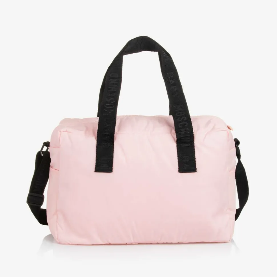 Stylish pink changing bag by luxury Italian fashion house Moschino Kid-Teen, made from silky smooth fabric. Instantly recognisable, it has the designer's signature Moschino Teddy Bear motif printed on the front with a white embroidered logo badge. The carry handles and adjustable shoulder strap are made in branded jacquard webbing, designed to fit neatly on the stroller handles. It has side pockets on the exterior and a zip-up main compartment with elasticated interior pockets for easy organisation. This bag comes with a branded changing mat, made from soft cotton jersey with a wipeable lining.
