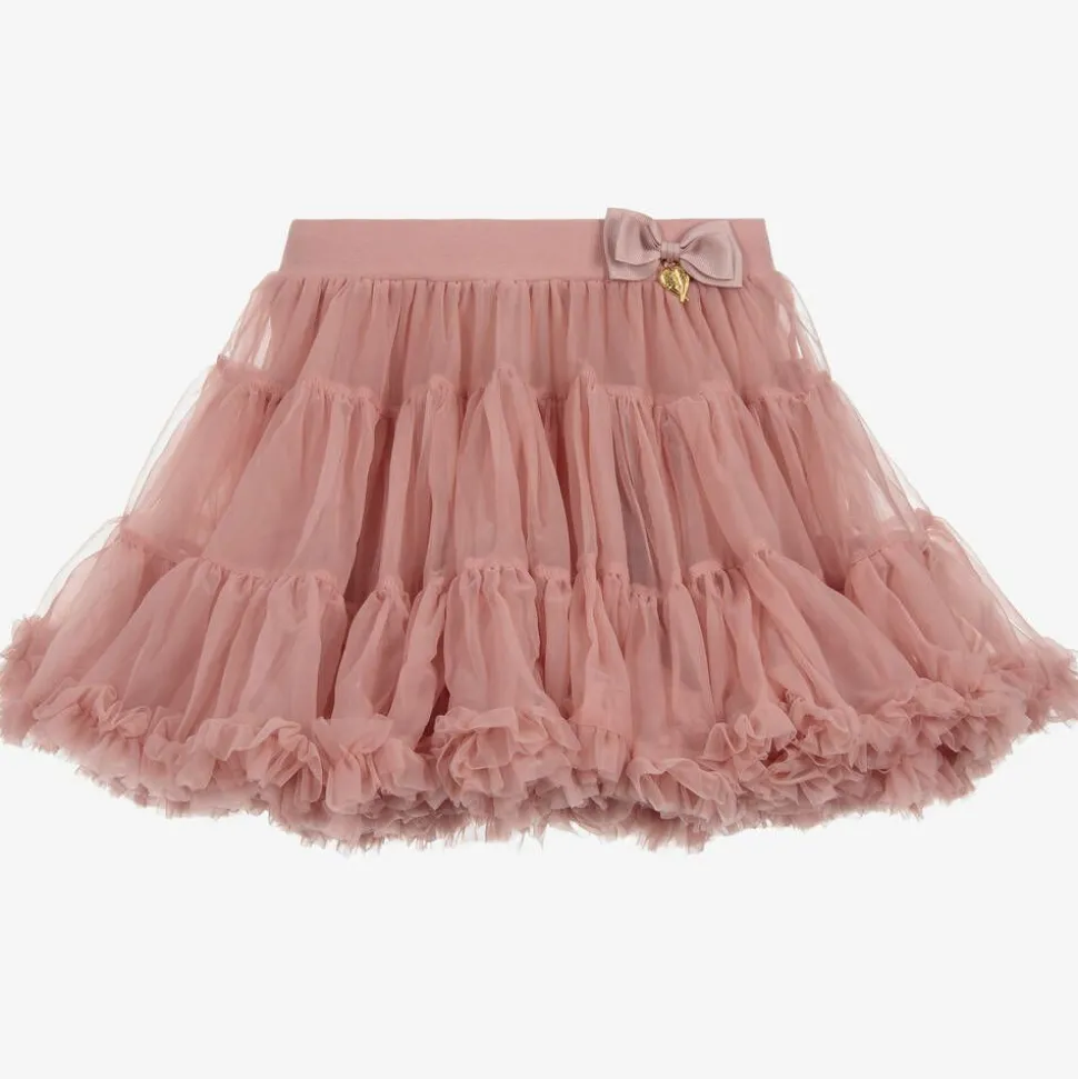 Girls pretty dusky pink tutu skirt by Angel's Face, made from layers of super soft tulle. Fully lined with stretchy cotton jersey for comfort, it has an elasticated waist with golden logo charm detailing.