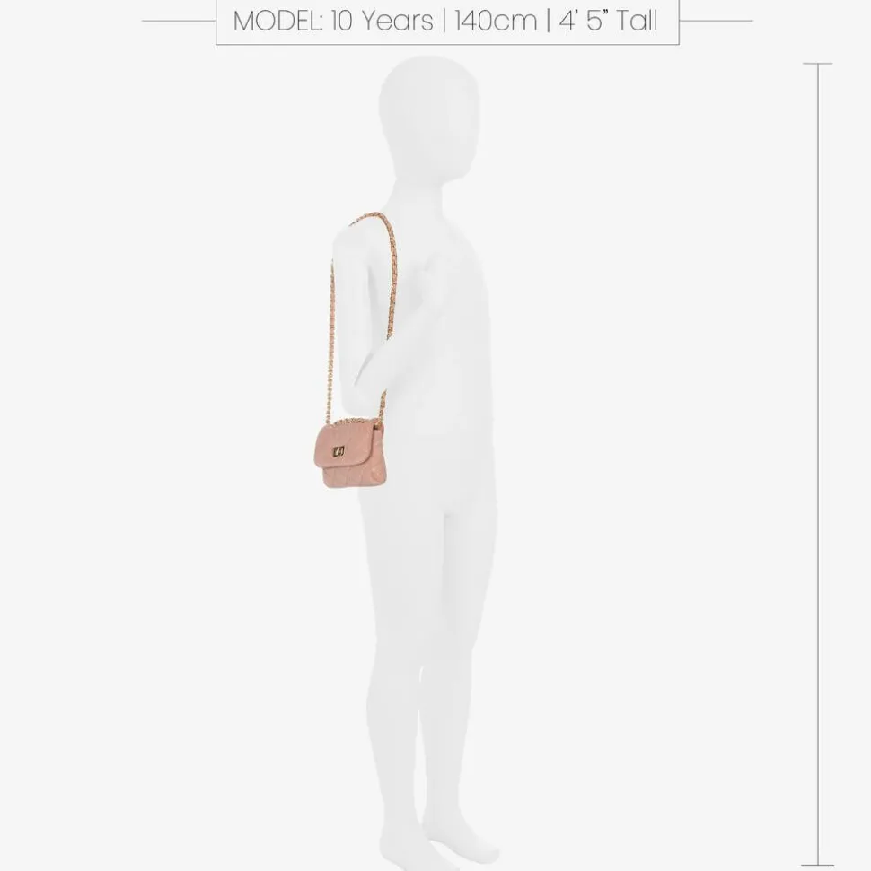 Girls small pink bag from Milledeux, beautifully handmade in soft quilted velvet. Lined in lightweight cotton, it is just right for carrying small essentials. The flap has a gold twist lock closure and the sumptuous velvet and gold chain strap can be doubled for a shorter length.