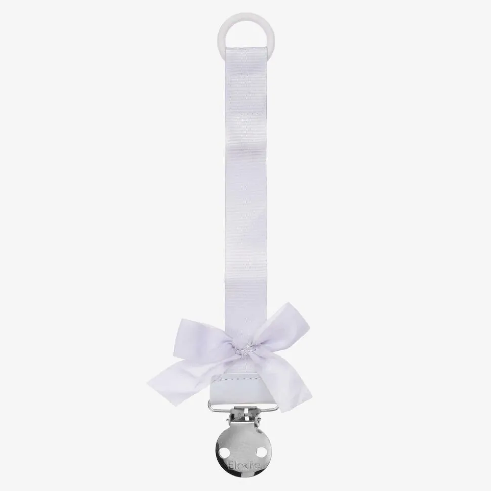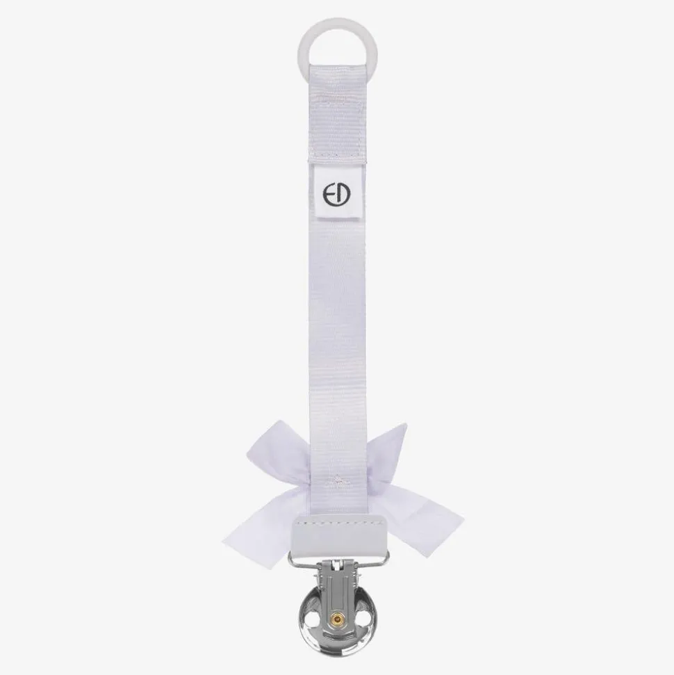 Lovely and practical, lilac purple dummy clip for baby girls by Swedish brand Elodie, decorated with a ribbon bow. Designed to help keeping your little one's dummy in place, the grosgrain ribbon strap has a branded, nickle-free steel clip on one end and a durable silicone ring on the other end. This item is made from recycled materials.
