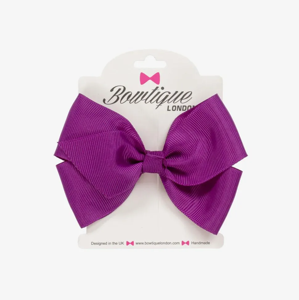 A purple hair clip for girls by Bowtique London, lovely to accessorise an outfit. The bow is handmade in delicate grosgrain ribbon and set on a slide-in metal clip.