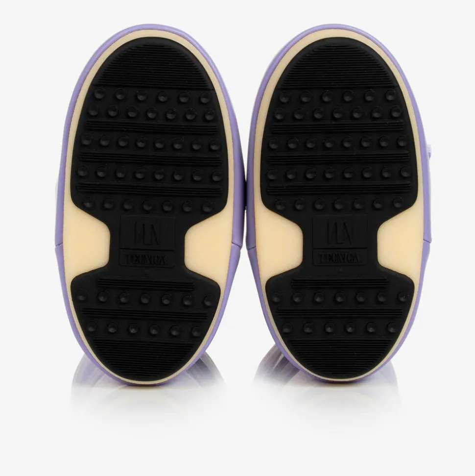 Lilac purple snow boots for boys and girls by Moon Boot, with a white logo print panel for a bold, branded look. Heavily padded and ultra resistant in the original style, they feature a two-tone thermoplastic sole with little suction pads at the bottom for improved grip. They have faux leather trims, a stylish lace-up look and a drawstring ties on the ankles to lock in warmth. The technological foam lining will feel snug at first but will mould to the size and shape of the foot after a few hours of wear.