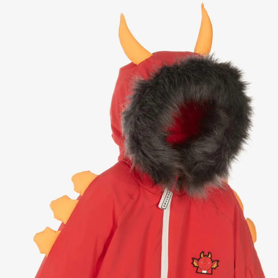 Roarsome designs this muted red zip-up snowsuit with pockets for boys and girls. A fun style from the British brand, it has a Blaze the Dragon patch on the front, horns on the hood, and little wings on the back. The recycled, matte fabric is coated in Teflon technology, helping to protect the fabric from stains. It has a zip-up ski pass pocket on the sleeve, and polar fleece around the neckline for cosiness. The sleeves have useful velcro straps to adjust around their gloves, and the leg cuffs have adjustable closures to fit snugly around snow boots. The detachable hood is trimmed with a removable faux fur edge, allowing for alternative looks. Generously sized, this snowsuit is designed to allow room for your little one to grow.