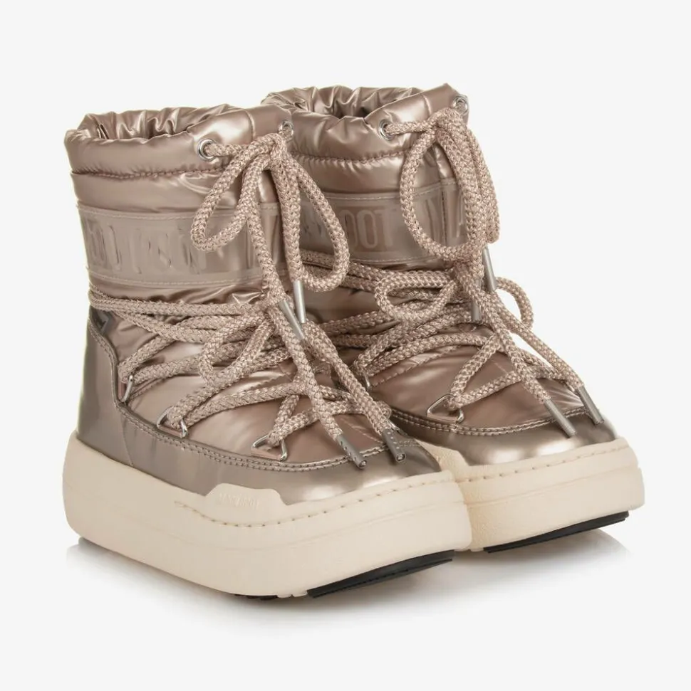 Designed by contemporary brand Moon Boot, these cool, futuristic rose gold boots for girls are made with a durable, smooth finish and have tonal branding. They fasten with laces for a super supportive fit and have a cosy fleece lining and insole. The chunky off-white outer soles are textured for grip on slippery surfaces.