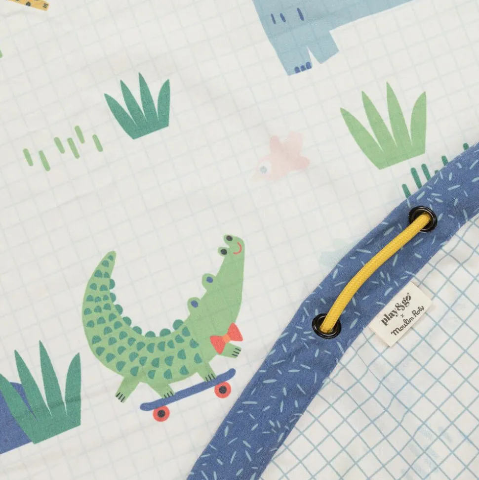 A unique 2-in-1 ivory playmat and storage bag for baby boys and girls from French brand Moulin Roti. It features a blue check pattern with colourful birds on one side and cute safari animals on the reverse, with blue patterned trim adding a lovely contrast. Lightweight yet durable, it is made in softly woven canvas with a handy drawstring around the edge, allowing the playmat to transform into a practical storage bag.