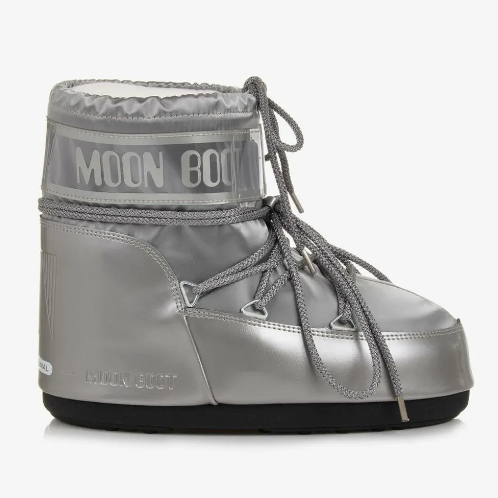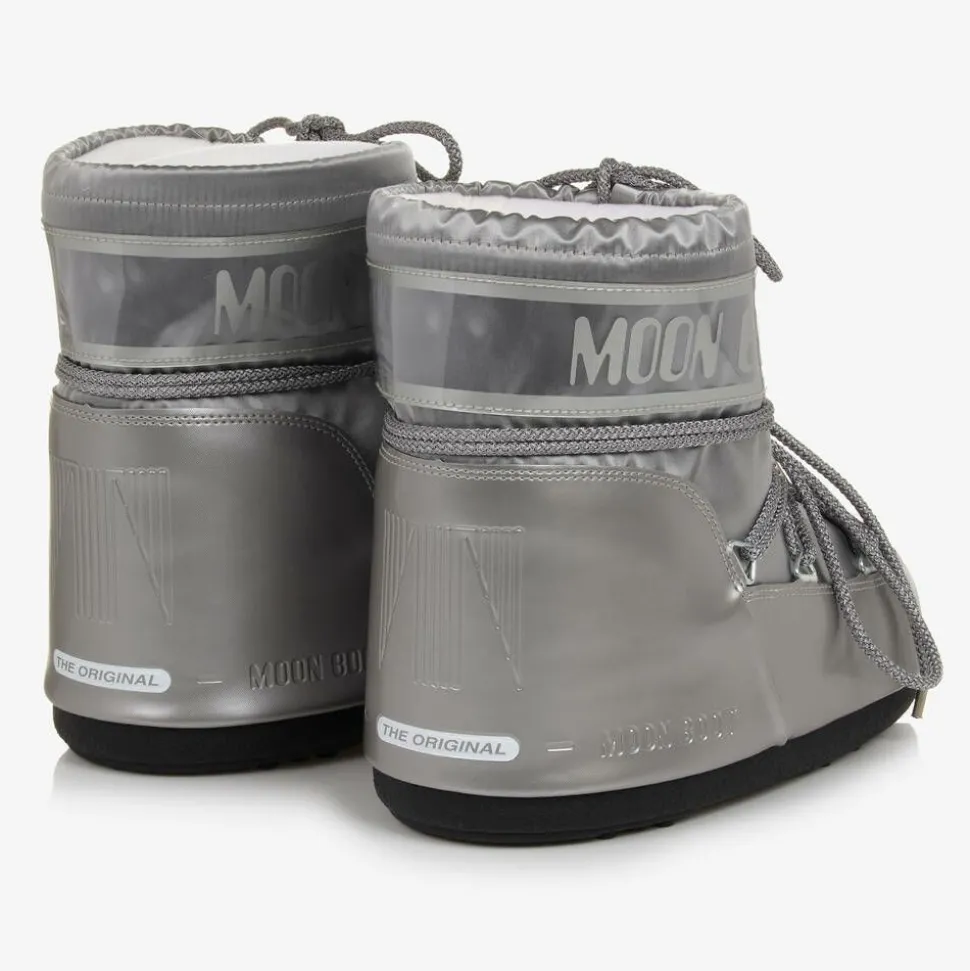Silver satin snow boots for boys and girls by Italian brand Moon Boot, with tubular laces that crossover on the front. In the original style, they feature a thermoplastic sole with little suction pads at the bottom for improved grip in slippery conditions. Water repellent, these low ankle-length boots are heavily padded for warmth with a drawstring at the top for added protection against the elements. An embossed logo design can be seen on the back of the heel with a logo-printed panel around the ankle for an iconic look. The technological foam lining will feel snug at first but will mould to the size and shape of the foot after a few hours of wear.