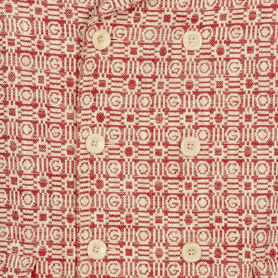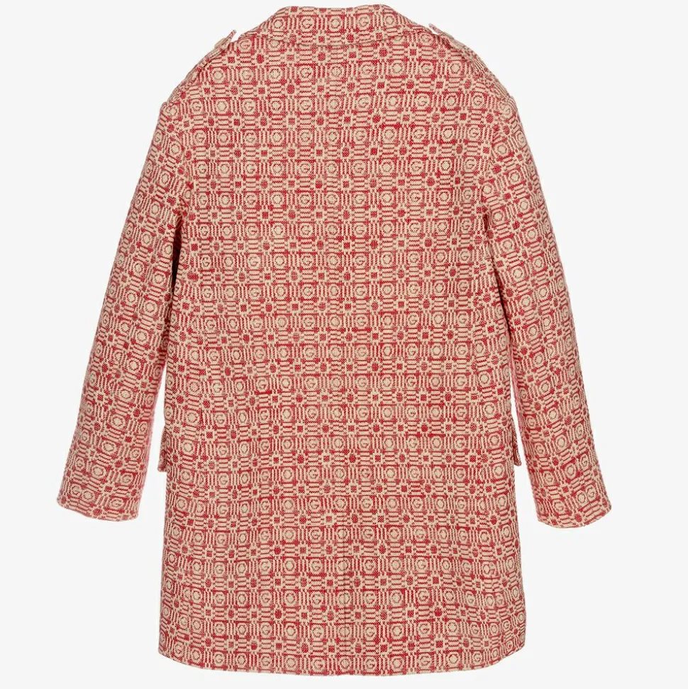 Red and ivory coat for teen boys by luxury Italian designer Gucci, made in a soft cotton jacquard weave. Forming part of the Aria collection, the GG motif is designed as a geometric circle pattern. With traditional styling, it has double-breasted mother-of-pearl front button fastenings. It is fully lined in silky cupro and has decorative front flap pockets.