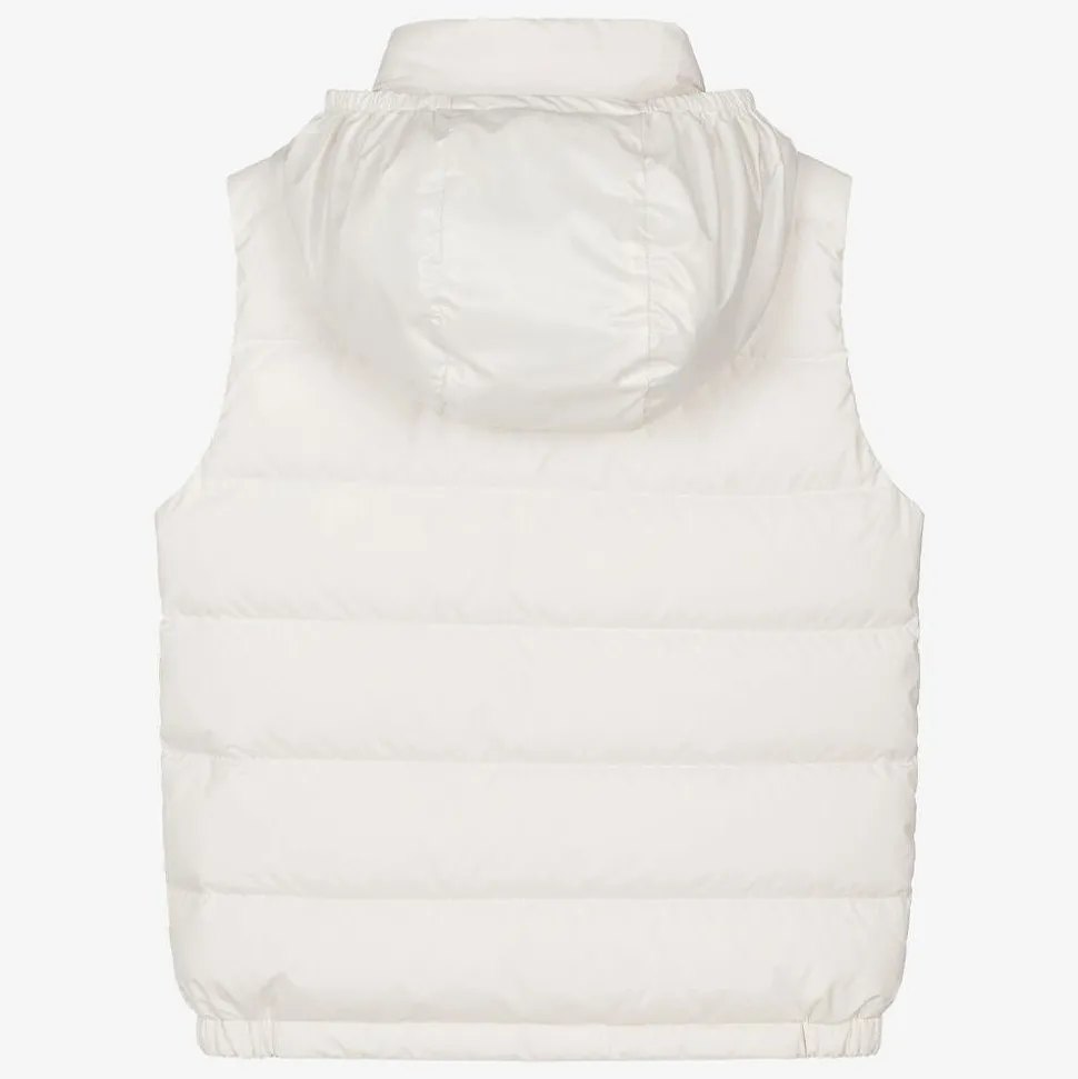 Cool for layering, this ivory gilet for teen boys and girls is from luxury designer Moncler Enfant. The brand's signature logo is embroidered over the front panel to create impact, and there is a branded tab on one side seam. This gilet is water-repellent, with cosy down padding and pockets that secure with poppers. A zip fastens on the front and a hood packs into the high neck.