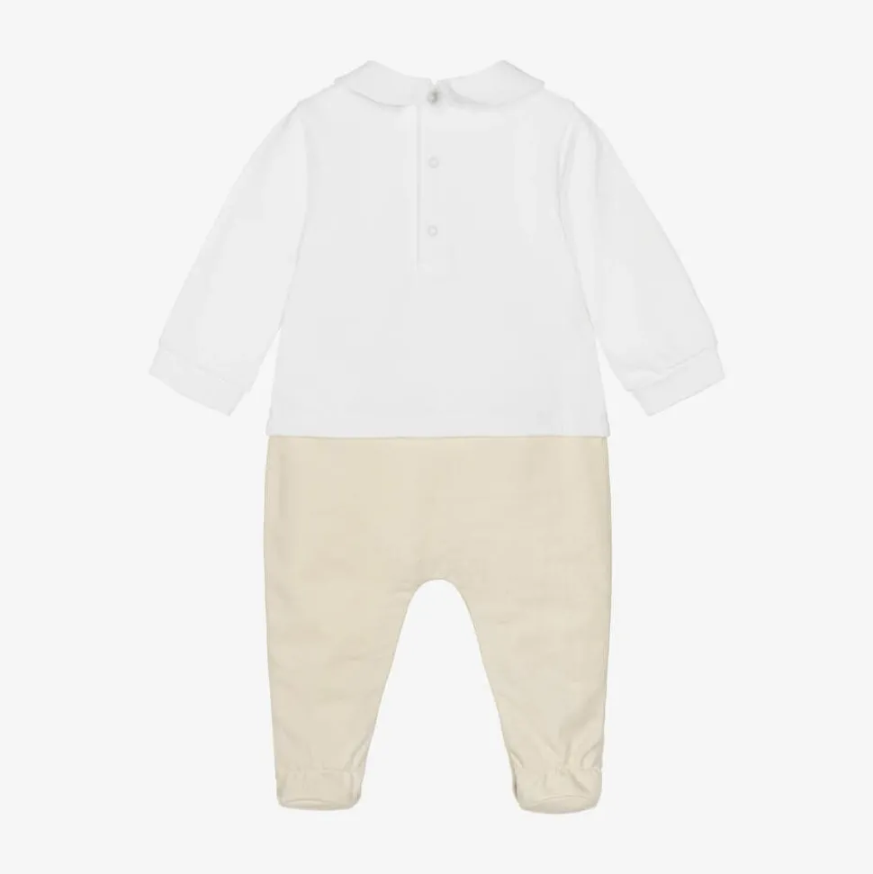 Lovely white and beige babygrow for boys and girls by Moschino Baby, made in soft organic cotton jersey. With the look of a top and trousers, this cute babysuit has a sweet Peter Pan collar and the iconic Moschino Teddy Bear logo printed on the front. It fastens with poppers on the back and between the legs.