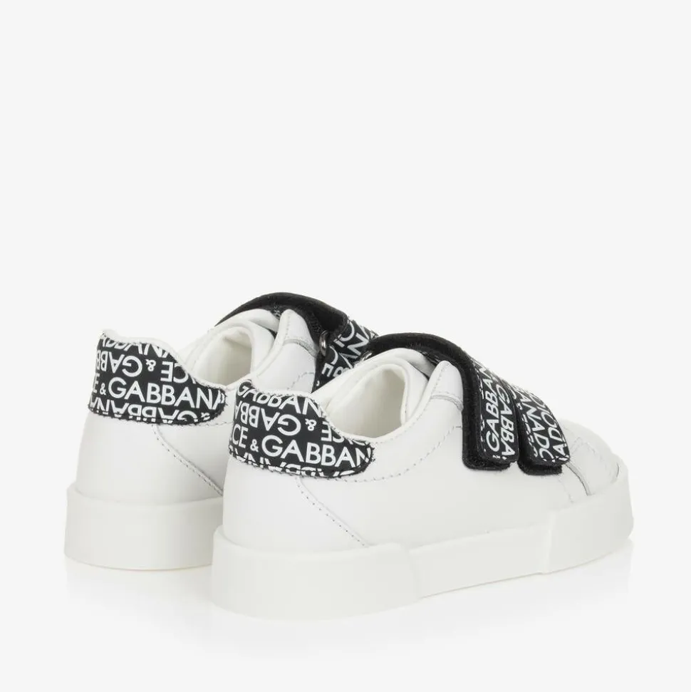 Cool white trainers for baby boys and girls by luxury label Dolce & Gabbana, made from smooth leather. They have black velcro straps and trims printed with a bold white logo pattern for a striking streetwear style. Lined in soft leather with a padded insole, they have non-slip rubber outsoles for good grip.