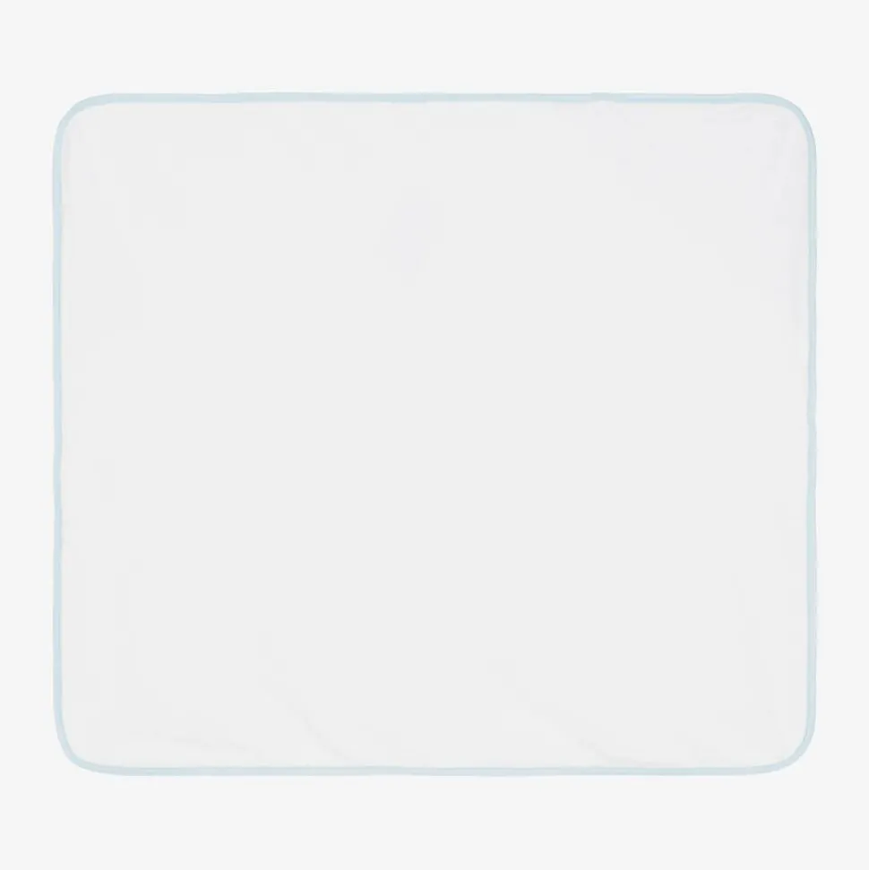 Baby boys and girls white and blue terry cotton hooded towel and wash mitt set from Kissy Kissy. Beautifully soft and fluffy, the Pima cotton hood is patterned with sweet Sophie La Girafe embroidery.