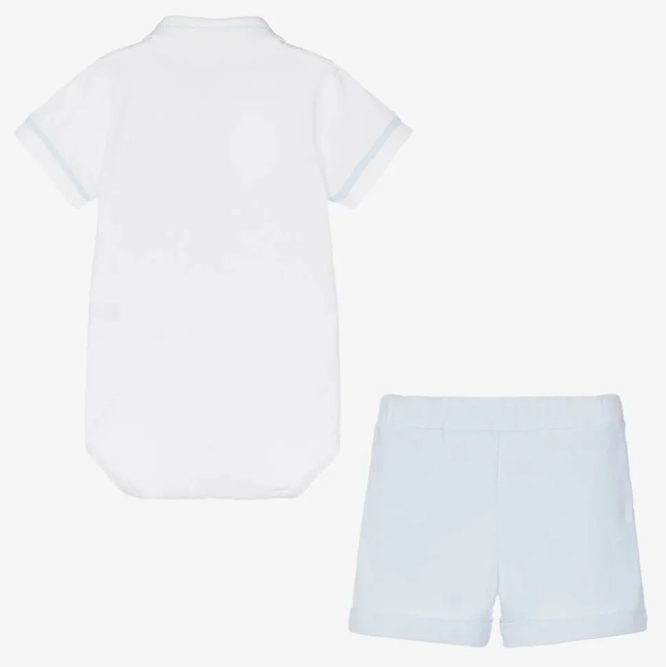 White and pale blue shorts set for baby boys by Sofija, made in soft and stretchy cotton jersey. Exclusive to Childrensalon, the white bodyvest has beautiful blue embroidery with pale blue trims. The blue jersey shorts have turned up cuffs and an elasticated waist for a comfortable fit.