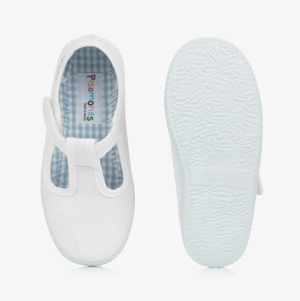 White T-bar shoes for little boys and girls by Pisamonas. Lined in soft gingham print canvas, these casual shoes have a rubberised outer sole for improved grip, and fasten simply with a velcro strap across the foot. The designer's colourful logo badge is stitched on the side of one foot, completing the style with subtle branding.
