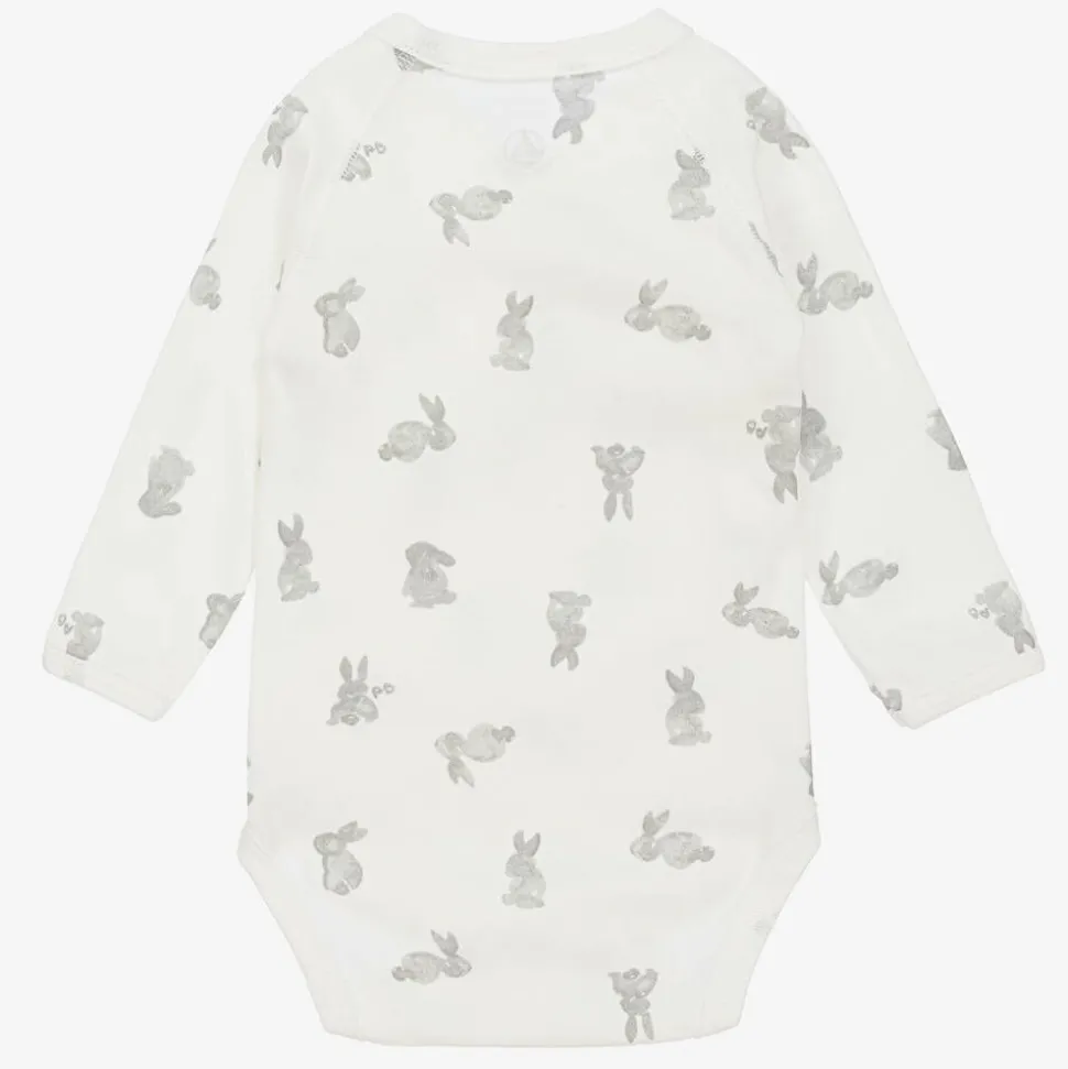 Sweet and simple, this pack of three white long-sleeved bodyvests for baby boys and girls is by Petit Bateau. One is printed with adorable pale grey bunny rabbits, another has tiny little stars, and the last is plain white. Made from soft cotton jersey and in a practical wrapover style, they have popper fastenings on the side and between the legs.