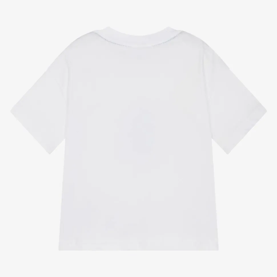 A white organic cotton T-shirt for boys and girls by Lacoste, made in comfortable jersey. A relaxed fit with short sleeves. it has a bold green circular logo print on the front, with the iconic crocodile badge for instant branded appeal.