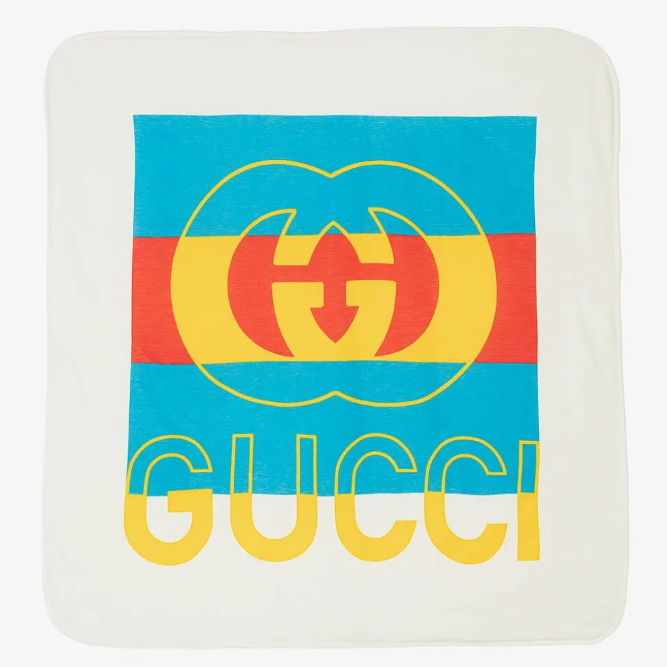 Unmistakable Gucci style for baby boys and girls, this white padded blanket has a bold red, yellow and blue design, featuring the Interlocking G logo. Made in beautifully soft and comfortable cotton jersey, it has a luxurious wool blend padding for added warmth. It makes an ideal nursery accessory or a comfortable surface for baby to lie on.