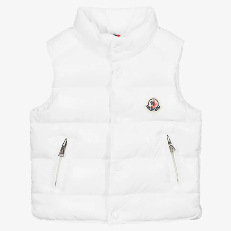 An off-white gilet for little girls and boys by luxury brand Moncler Enfant. Silky smooth and water repellent, it is padded with luxuriously soft down for comfort and warmth. The front zip is secured behind a popper fastening placket for better insulation. There are zipped pockets and an embroidered logo badge on the chest.