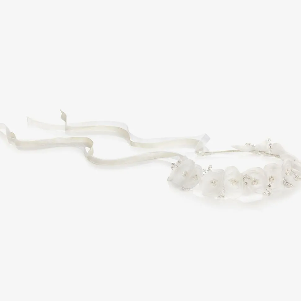 Girls beautiful ivory satin garland with white organza poppies by Sienna likes to party. The flowers have pearl and crystal beads in their centres and are detailed with tiny embroidered daises and silver metal wirework. This lovely vintage-style garland fastens at the back with white organza and ivory satin ribbons which will trail slightly down the back.
