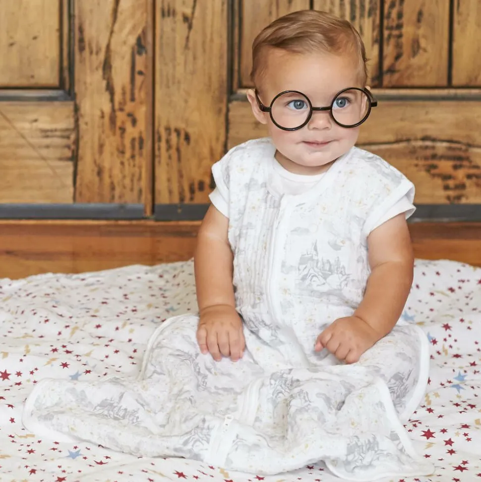 White Harry Potter cotton muslin sleep bag for baby boys and girls by aden + anais, with a playful Hogwarts print. Super soft and lightweight, with a 1.0 tog warmth rating, this comforting sleep bag fastens with a zip on the front.
