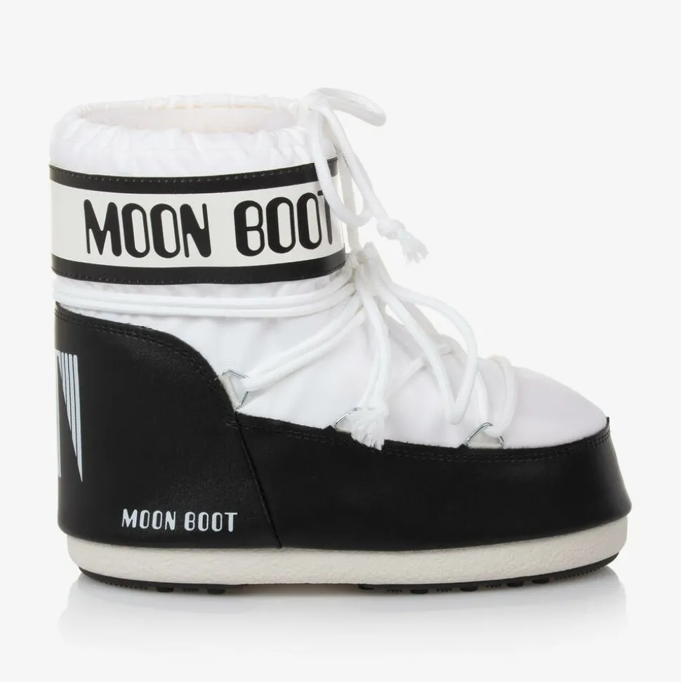 White and black shorter-length snow boots for boys and girls by Moon Boot, with a bold logo print panel for an iconic look. Heavily padded and ultra resistant in the signature style, they feature a two-tone thermoplastic sole with little suction pads at the bottom for better grip. They have branded faux leather trims, a stylish lace-up look and drawstrings on each ankle to lock in warmth. The technological foam lining will feel snug at first but will mould to the size and shape of the foot after a few hours of wear.
