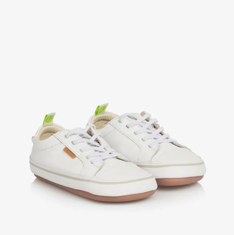 White first walker trainers for baby boys and girls by Tip Toey Joey. Made in super soft, supple leather, they have elasticated laces across the foot and stretchy elastic around the heels, making them easy to slip-onto little one's feet. They have a rubberised logo on one side and a beige stripe around the midsole. The grippy non-slip rubber soles are flexible, great for supporting your child during their first steps.