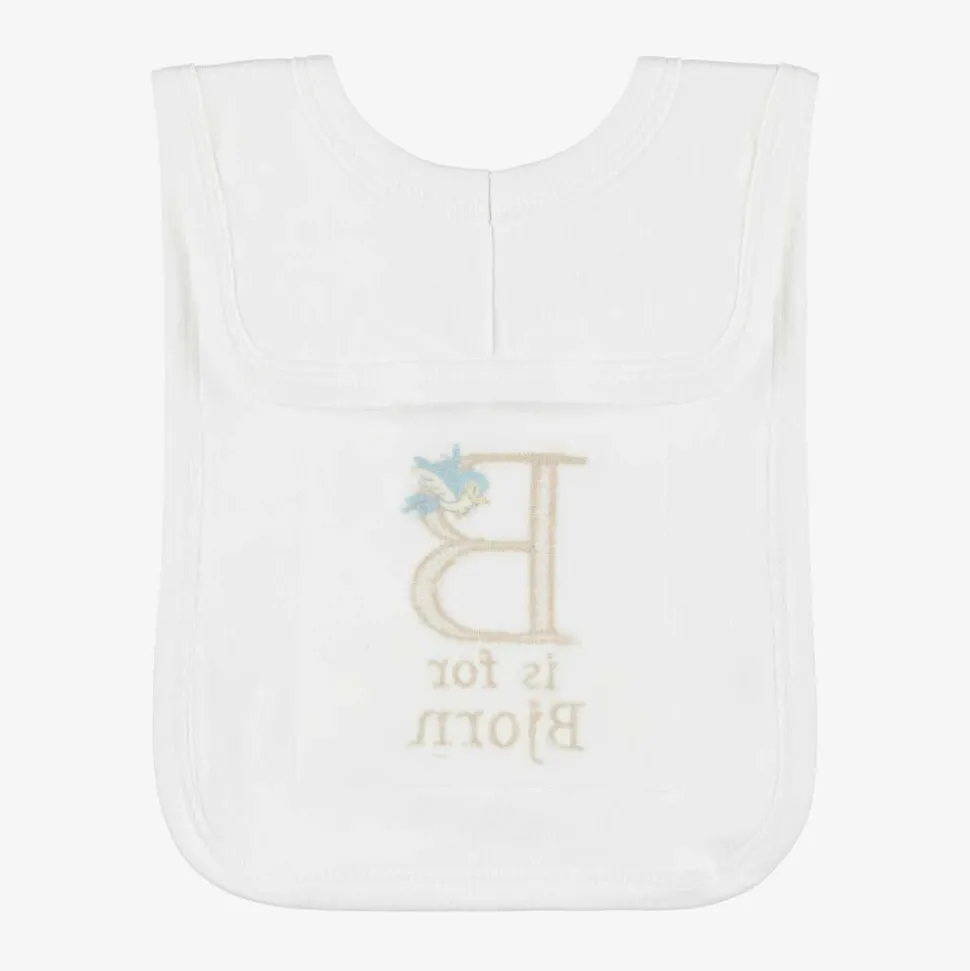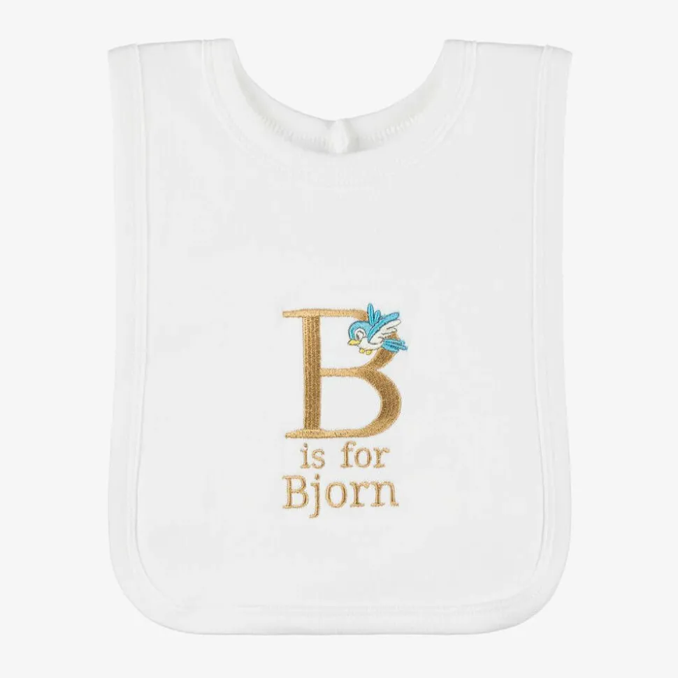Cute white bib for baby boys and girls by Paint My Dreams, the British label. Made in soft cotton jersey for gentle comfort against delicate skin, this useful feeding accessory is ideal for catching small spills and dribble, and simply slips on over the head. Your little one's name can be embroidered below the 'B' initial and sweet bird motif, making a thoughtful gift.