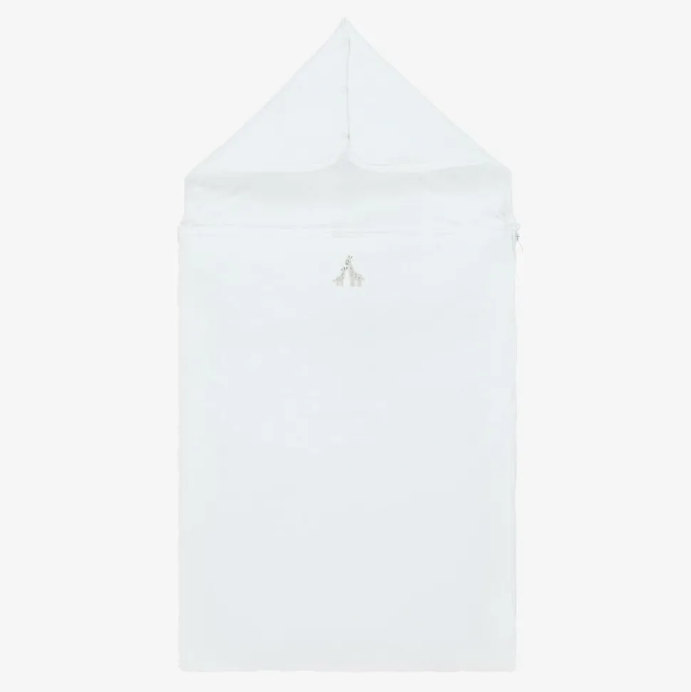 Exclusive to Childrensalon, a white nest for baby boys and girls by Kissy Kissy, made in super soft Pima cotton jersey. Lightly padded for warmth, this cosy nest has cute grey hand-embroidered giraffes on the front. It has a zip fastening on one side and the popper fastenings on the hood can be opened to lay it flat.