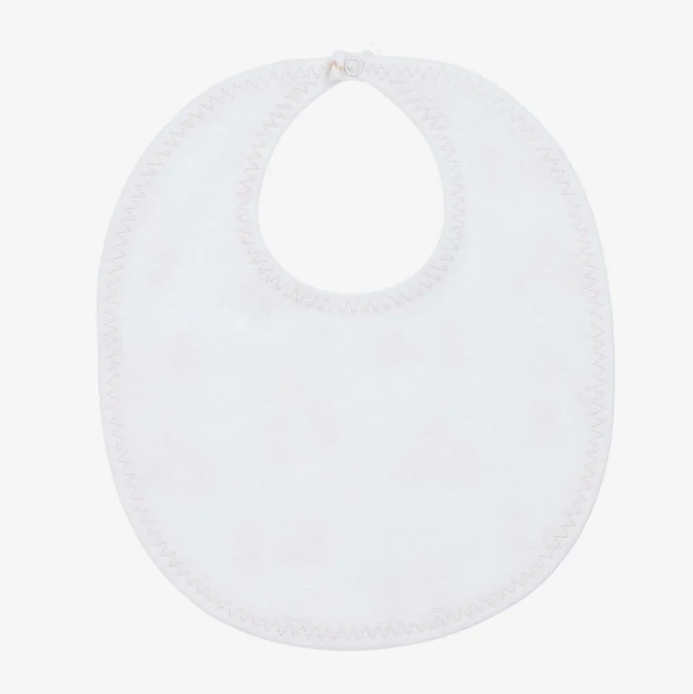 White bib for baby boys and girls by Kissy Kissy, with an adorable bear cub and bee hive pattern. Ideal for catching little spills, it is made in soft Pima cotton jersey, with an absorbent towelling lining and popper fastening.