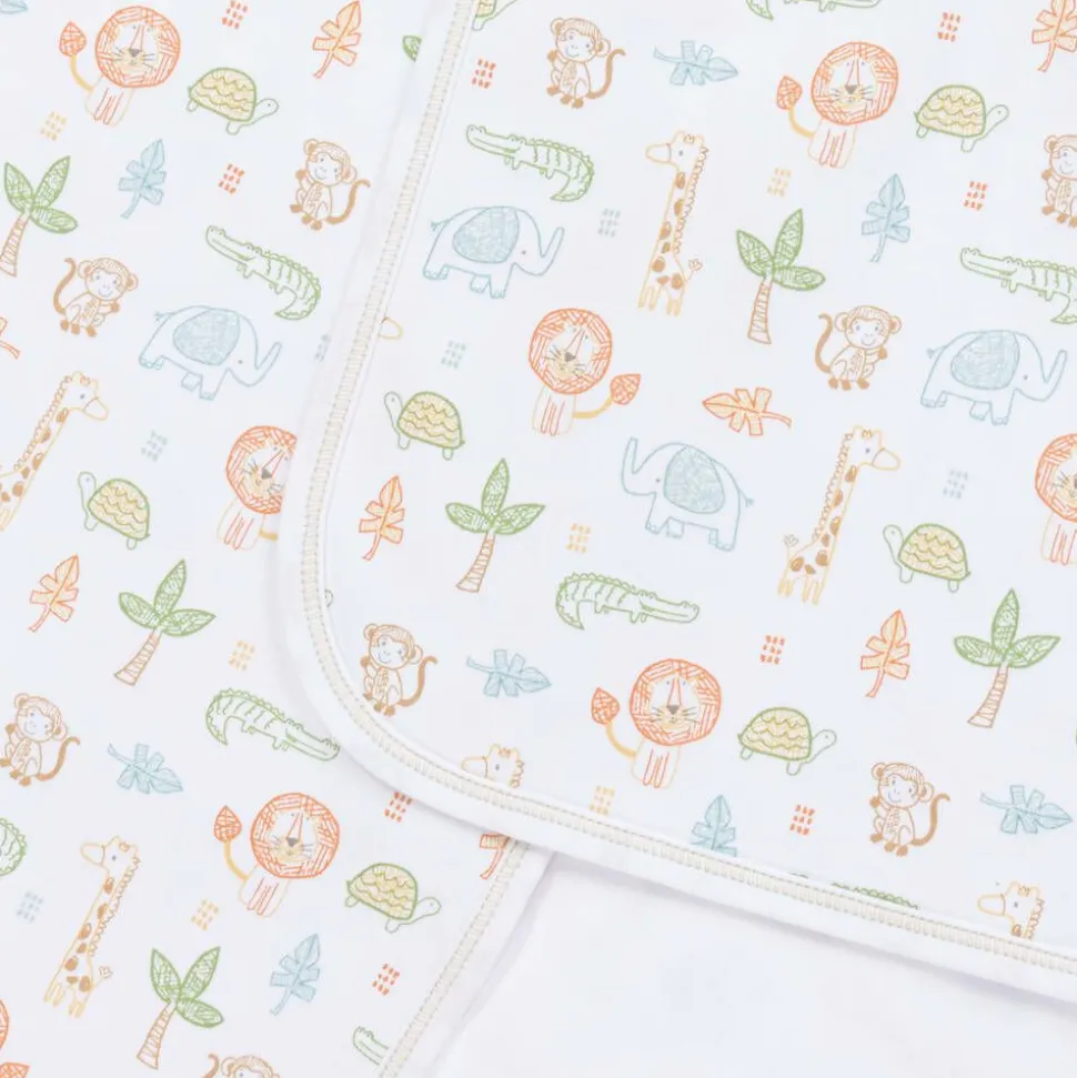 Super soft white Pima cotton blanket for baby boys by Kissy Kissy, with a colourful jungle animal print. Made in a double layer of super soft, comfortable jersey, it is ideal for the nursery or when out and about in the pram or car seat.