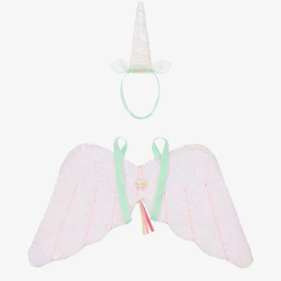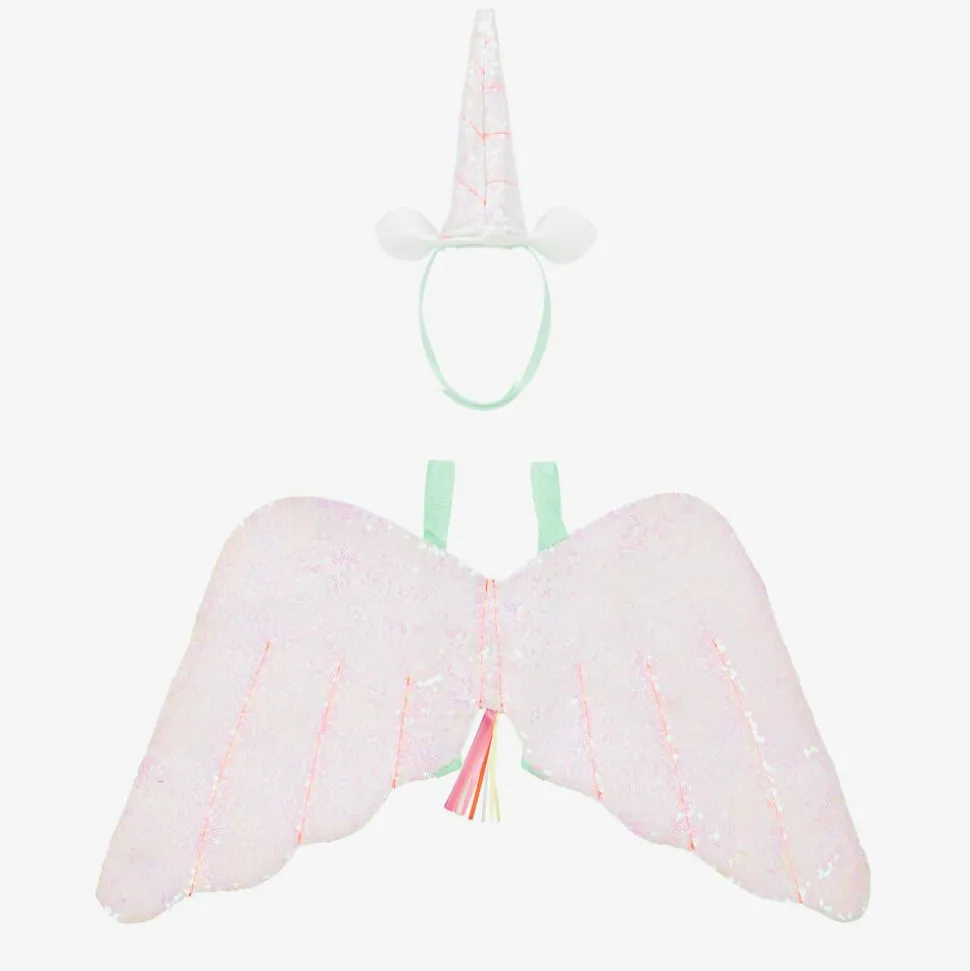 A white and pink unicorn dressing up costume for girls by Meri Meri, sparkling with iridescent sequins. Dreamy and magical, the wings have pastel-coloured satin tassels and glittery green elasticated shoulder straps. A matching horn headband completes the look, fastening effortlessly with velcro.