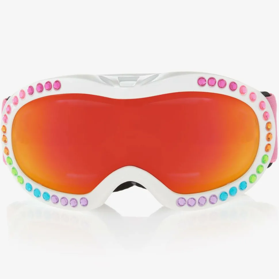 White anti-fog ski goggles for girls by Bling2o, decorated with colourful rhinestones. Lightweight, with pink and yellow tinted lenses, they offer 100% UV protection against the sun's harmful rays. They have a double layer of foam and a stretchy pink adjustable strap. They come with a branded pouch and hard carry case for safe storage.