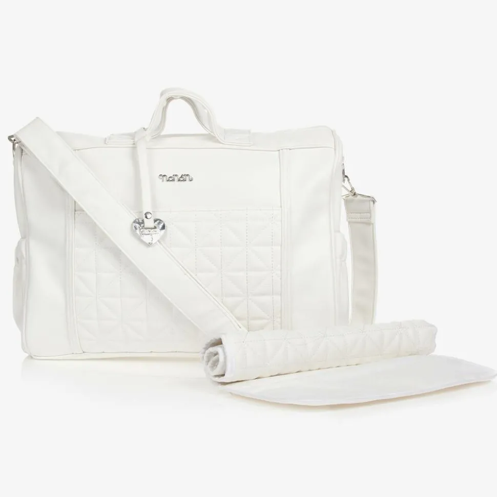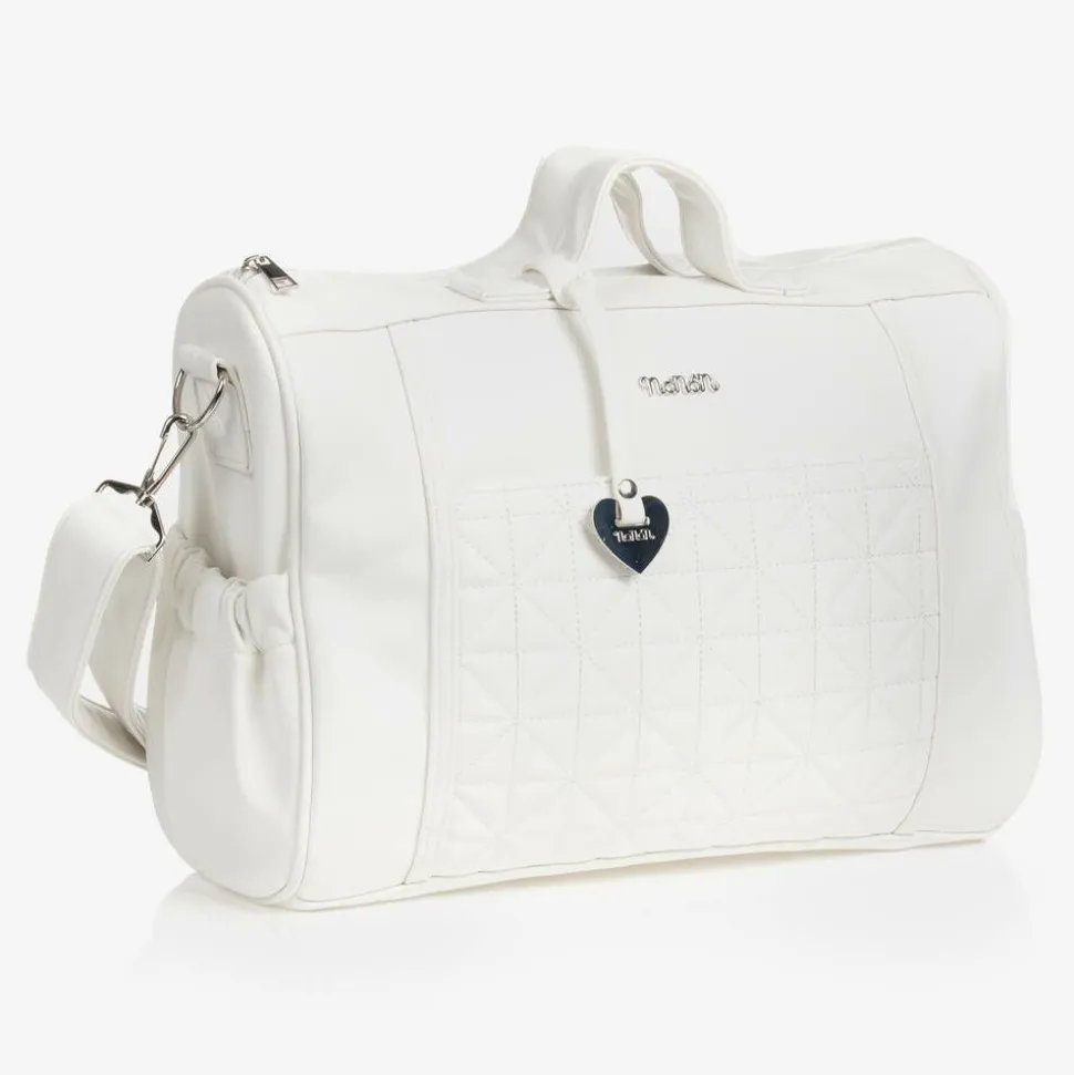 Lovely white changing bag by Nanán, made in soft faux leather with a smooth, luxe feel. The front has a stylish quilted front pocket, with a shiny silver logo appliqué and useful side pouches for bottles and other essentials. Featuring a silky, logo-print lining, it has a spacious main compartment with an internal elasticated pouch to keep belongings organised. It comes with a matching, quilted changing mat and has an adjustable, detachable shoulder strap.