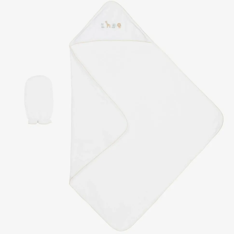 White hooded towel and mitt set for baby boys and girls by Kissy Kissy. Made in fluffy cotton towelling, this cosy towel is ideal for keeping your little one warm and dry after bath time. It has a lovely beige picot trim and cute embroidered baby safari animals on the soft jersey hood. Beautifully soft against delicate skin and absorbent, it comes with a luxuriously soft white wash mitt.