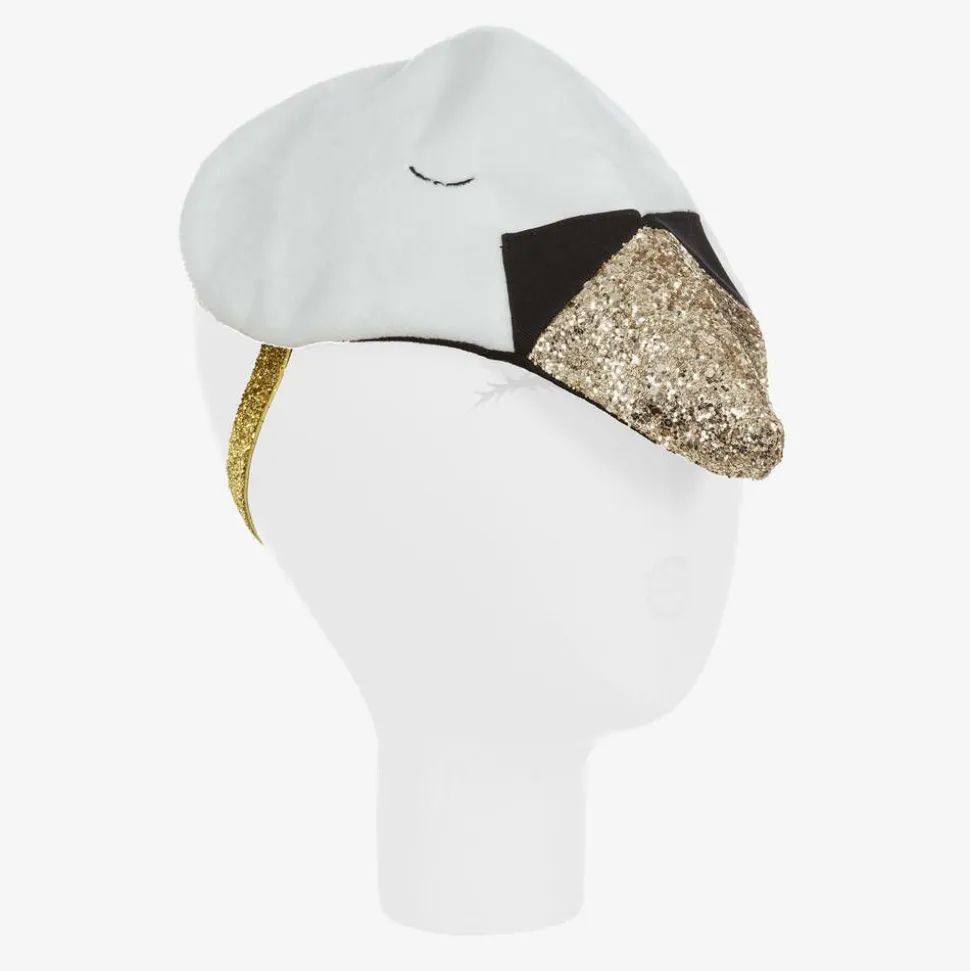 Boys and girls will love to play in this sweet swan costume from Meri Meri. The cape is crafted in cascading layers of white tulle with delicate golden thread to create fun ruffled wings. There are glittery gold elasticated straps stitched on the lightweight lining in which to put little arms through. The luxuriously soft cotton-blend velvet headdress is designed in the shape of a cute swan face, with a glittery gold beak and sparkling elasticated velcro strap. The headdress is lined with soft cotton twill for comfortable wear.