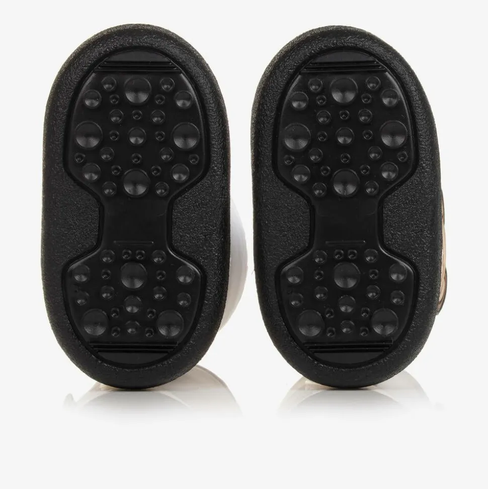 Stylish white snow boots for boys and girls by Moschino Kid-Teen. The iconic Moschino Teddy Bear logo patch can be seen on the sides, with a logo embroidered beneath. There are drawstring fastenings around each calf to keep feet dry, warm and cosy. The super soft and snuggly fleece lining adds extra warmth and the thick rubber soles have textured treads to improve grip on the snow.