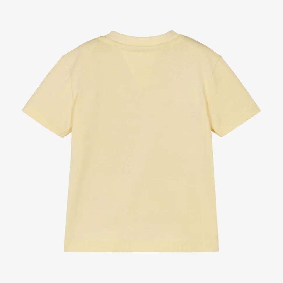 A pastel yellow T-shirt for baby boys and girls by Tommy Hilfiger, made in soft and stretchy cotton jersey for comfort. A branded look, it has a rubberised logo design on the front and the iconic flag embroidered on one sleeve. There are convenient popper fastenings on one shoulder to help with dressing.