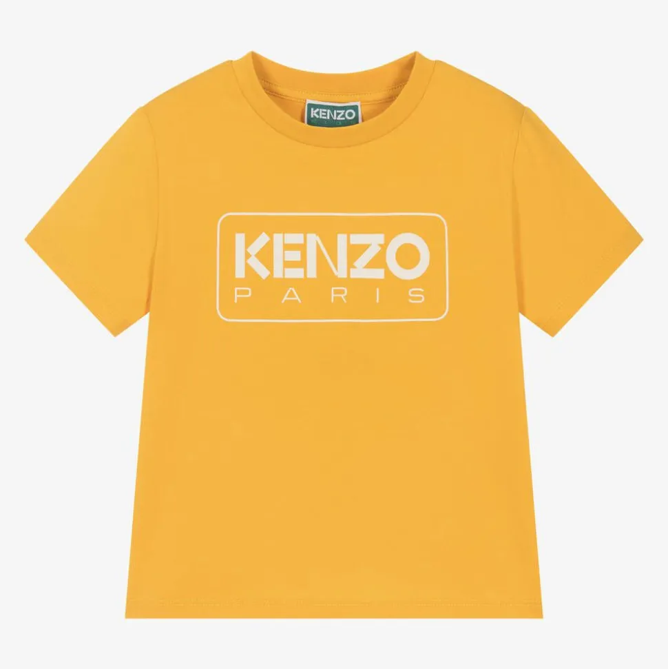 Yellow T-shirt for boys and girls by KENZO KIDS, made in soft organic cotton jersey. This casual tee has a gently ribbed crew neck and short sleeves. A white Kenzo Paris logo is printed on the front for instant brand recognition.