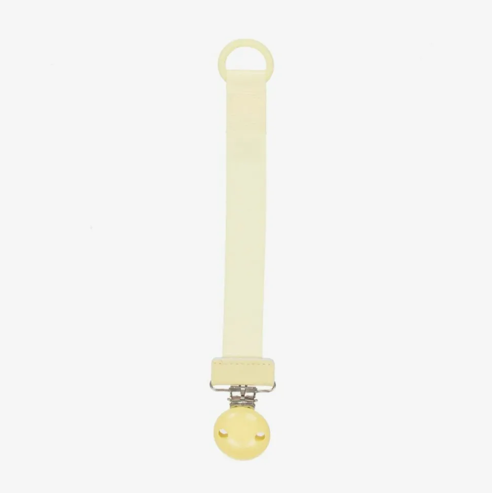 Yellow dummy clip for baby boys and girls by Swedish brand Elodie. Made from recycled grosgrain ribbon, the strap has a durable silicone ring to attach to your little one's dummy. The metal buckle has a lacquered wood covering and attaches onto their clothing to prevent it from getting lost.